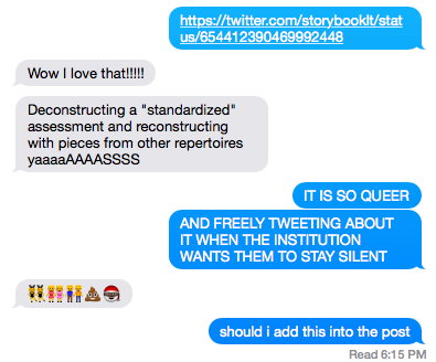 Teens, pushing against the hegemonic forces that instruct them to hush about Herminia—that's where the real learning in this situation is for them. Not in the expected comprehension of supplied rhetoric that is considered "standardized," but questioning and crossing those lines that were drawn for them. Not filling the bubbles with their No. 2 pencils, but bursting the bubble on the educational paradigm.