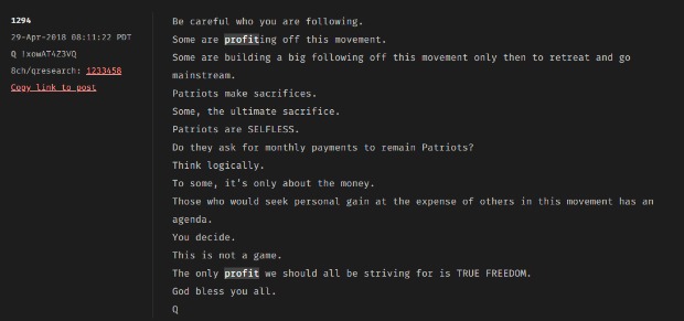 Several Q posts have attacked the patriotism of those profiting off the movement, with one post declaring that “The only profit we should all be striving for is TRUE FREEDOM.”