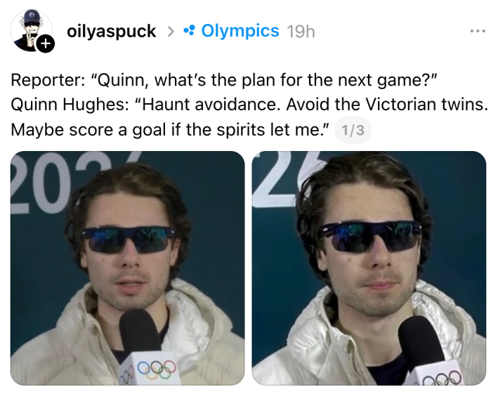 Even hockey-adjacent fandoms joined in. Fans folded Hughes and his spirits into Heated Rivalry fanfiction. As @kate.hawthorne admitted, "the Quinn Hughes talking to the ghosts who want him to matchmake Shane and Ilya is the absolute best thing I've ever read."