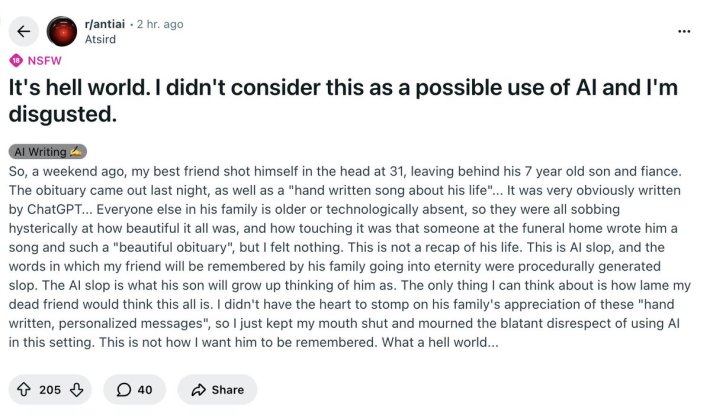 "This is not a recap of his life," they continued. "This is AI slop, and the words in which my friend will be remembered by his family going into eternity were procedurally generated slop."