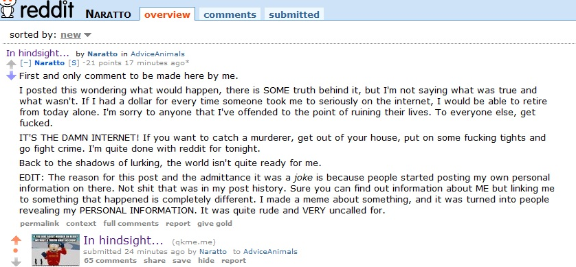 As murder confessions go, it was fairly innocuous and unprovable, and the fact that it was made using Naratto's actual Reddit account, rather than a "throwaway" with no ties back to his previous posts or other personal details, made many people skeptical. Within moments of his posting, redditors, in now-deleted comments, unearthed "everything from name, DOB, jobs, location, FB, Twitter, Myspace, the whole deal," and debated began over whether his confession was serious enough to warrant reporting to authorities.