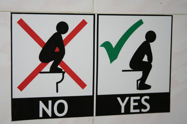 You enter a public restroom. Just before you do your business, you suddenly have a difficult dilemma: "Do I sit on the toilet or crouch atop it?" As you rack your brain trying to remember the proper procedure, fate smiles upon you in the form of a sign: