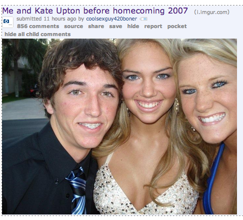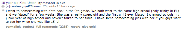 And oh boy, did coolsexguy420boner deliver. Earlier today, he posted the above selfie with Upton and an unidentified blonde female in r/pics, claiming the photo was from a 2007 homecoming dance. He also provided more details of his relationship with Upton, which apparently was fairly chaste and lasted only a few months: