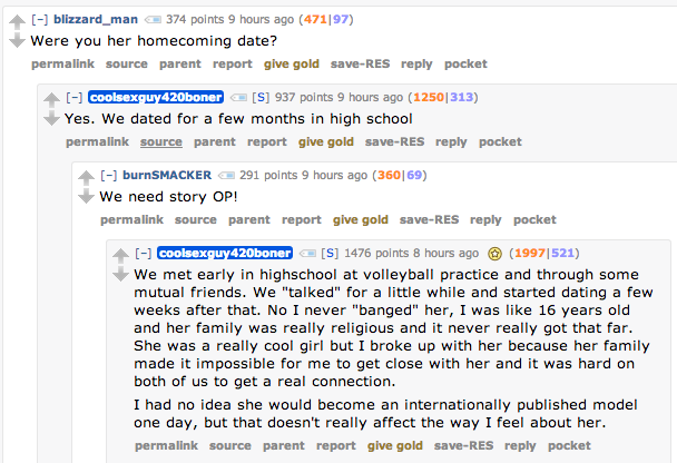 Whether coolsexguy420boner’s story is legit or not (although honestly, I’m inclined to think it is—why else would someone post such an unflattering photo from their high school years, unless they needed proof they briefly dated a supermodel?), it’s clear that most redditors want to believe.