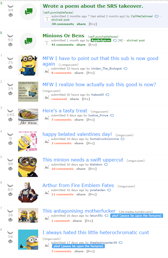 The best thing about the subreddit now are the people completely divorced from all the drama, wandering into r/punchablefaces and witnessing a totally bewildering meme holocaust. The posts are evenly divided between people eager to share Minions and those still wondering what the hell is going on. The earnest posts of dejected curiosity are the best.