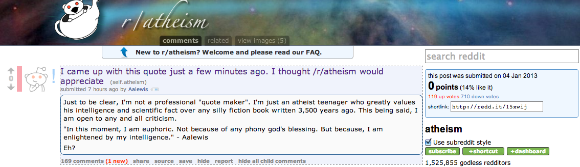 The one guideline the community has latched onto in particular and gravely misunderstood is regarding image sharing. Since the beginning, r/Atheism prided itself on being free and open, relying on Reddit's public voting system to determine what content reaches the community's front page and potentially Reddit's front page. (As a default subreddit with more than 2 million readers, all new registered Reddit users are automatically subscribed to the forum.)