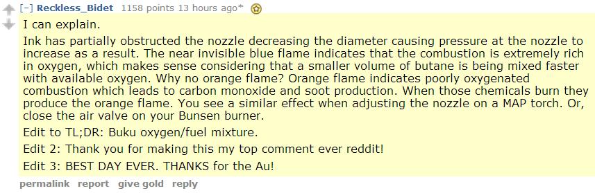 This rags-to-riches story began late Sunday evening when Reddit user sirderpenson discovered that the ink from a busted pen in his pocket had done something odd to his cigarette lighter. Instead of producing an orange flame, it now produced a half-invisible blue one.