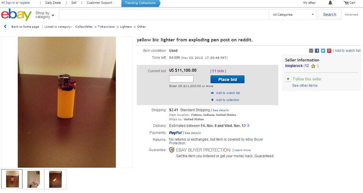 The lighter was a mini yellow Bic lighter that was in a junk drawer in my bedroom, I was carrying it around with me along with a Fisher space pen in my pocket. I thought I felt something wet on my leg than I reached into my pocket and felt the ink encasing the lighter, the next day I decided to test the lighter and that happened I honestly have no idea why the lighter does this. I never really got any attention on reddit so this was very surprising to get all of this. I'd be plenty happy to not get any money from the lighter because of all the attention I recieved. I decided to put the lighter up for auction just for fun and when I said all of the proceeds were going towards Reddit that is when the bids began to roll in. I do suspect 4chan is trolling me which is unfortunate because I'd love to give back to the Reddit community.