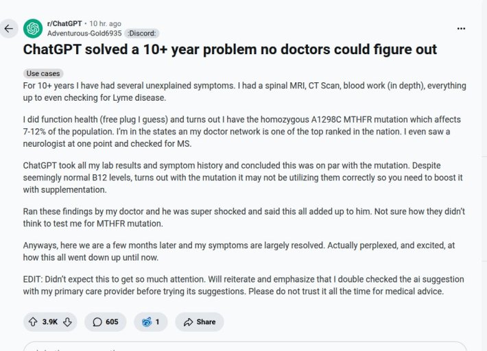 "ChatGPT took all my lab and symptom history and concluded this was on par with the mutation," the redditor wrote. "Despite seemingly normal B12 levels, turns out with the mutation it may not be utilizing them correctly so you need to boost with supplementation."