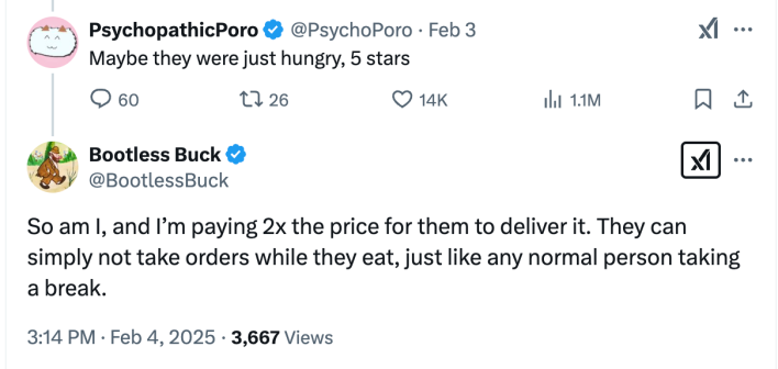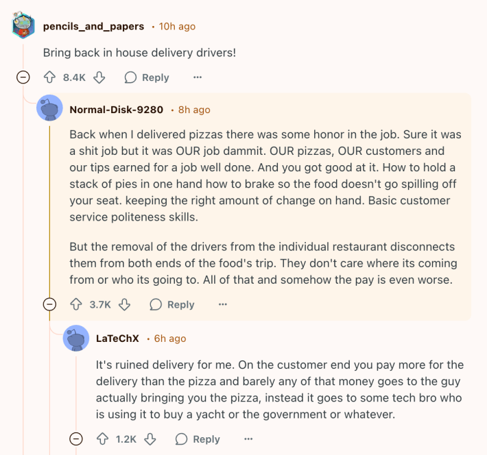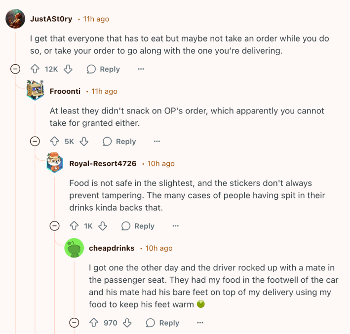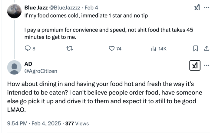 Even without further context, it didn’t take long for the image to spread across social media. To those frustrated with the state of delivery apps, it served as more proof that the way they have "disrupted" the food delivery industry has only made things worse for customers. To others, it was emblematic of entitlement, accompanied by the suggestion that anyone who expects timely, accurate orders should go get the food themselves.