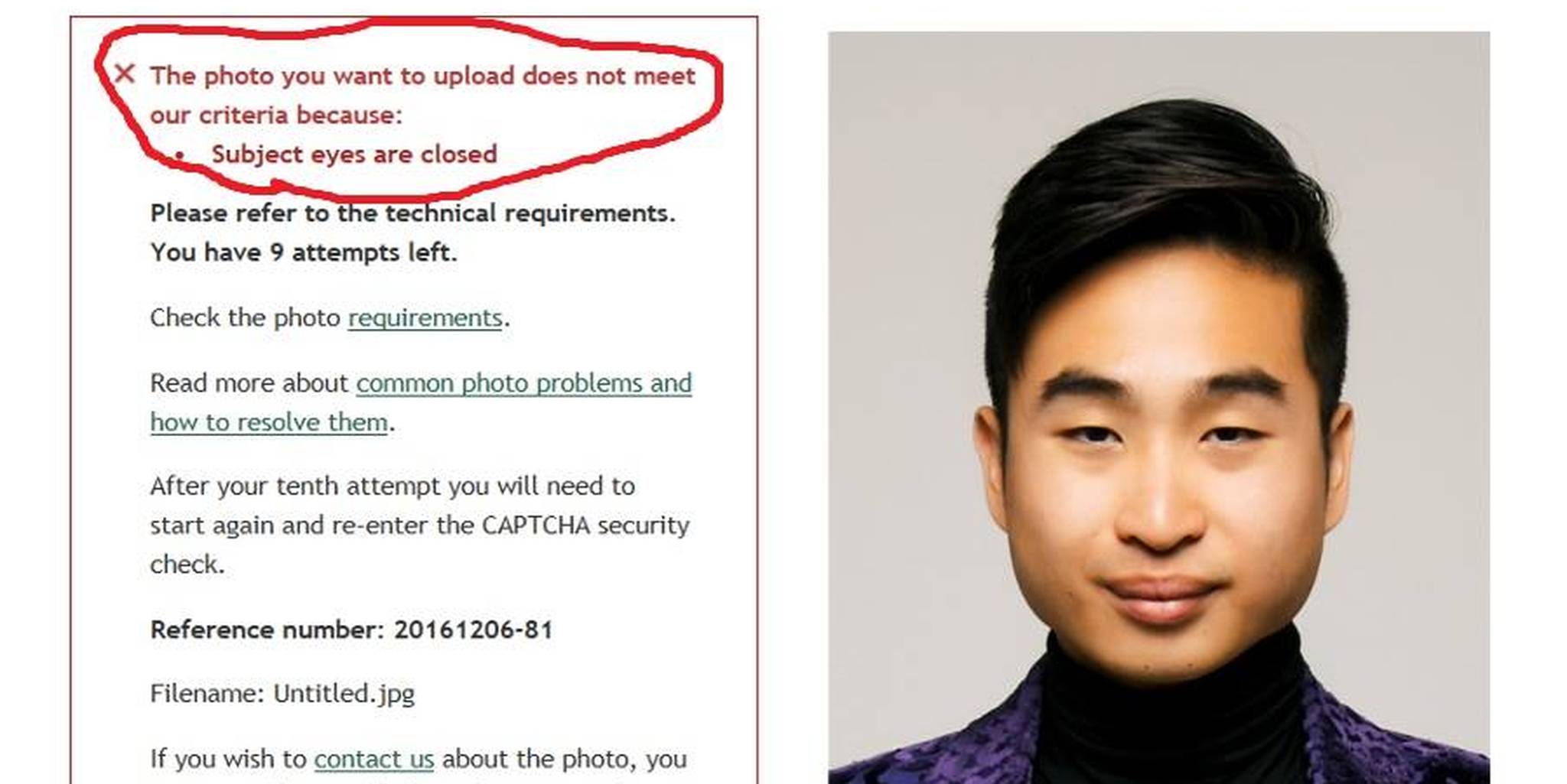 Richard Lee, a 22-year-old New Zealander of Asian descent, recently had his passport photo rejected when the automated facial recognition software registered his eyes as being closed. Lee posted about the incident on Facebook.