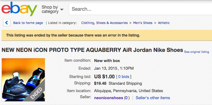 Not to be deterred, over the weekend Riff Raff posted a link to an eBay auction containing the purported "Neon Icon Proto Type Aquaberry Air Jordan" sneakers. While the shoes look suspiciously like a custom painted pair of Jordan Vs—or perhaps even a Photoshop—bids on the auction, which began at $1, reached as high as $1 million before Riff Raff canceled the listing.