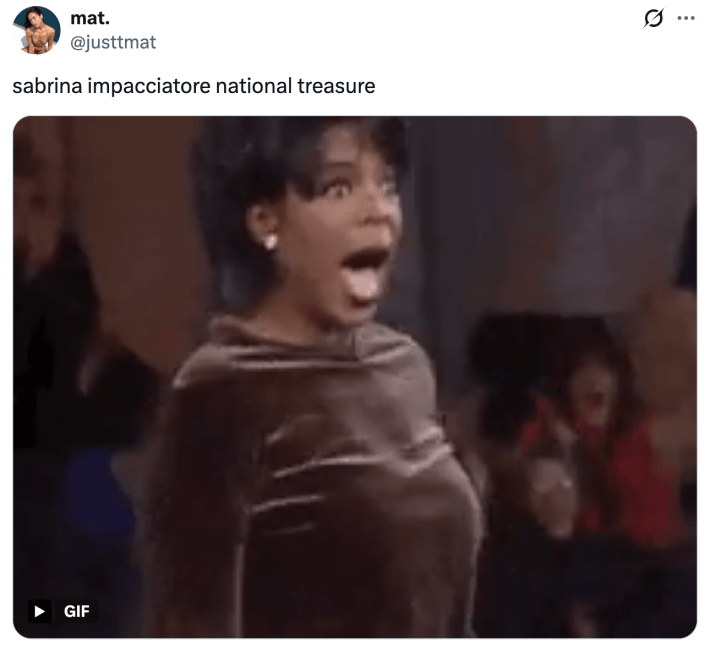 It seems that the Italians were especially entranced by Impaccitore's performance. A fifth post is translated as saying: "SABRINA IMPACCIATORE YOU ARE EVERYTHING."