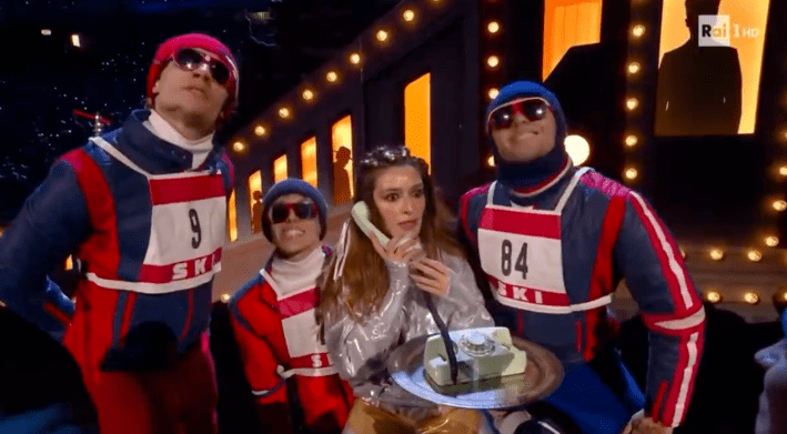 The performance began with an animated sequence showing what appears to be Impacciatore essentially skiing and skating through the Winter Olympic Games and cites of bygone years.