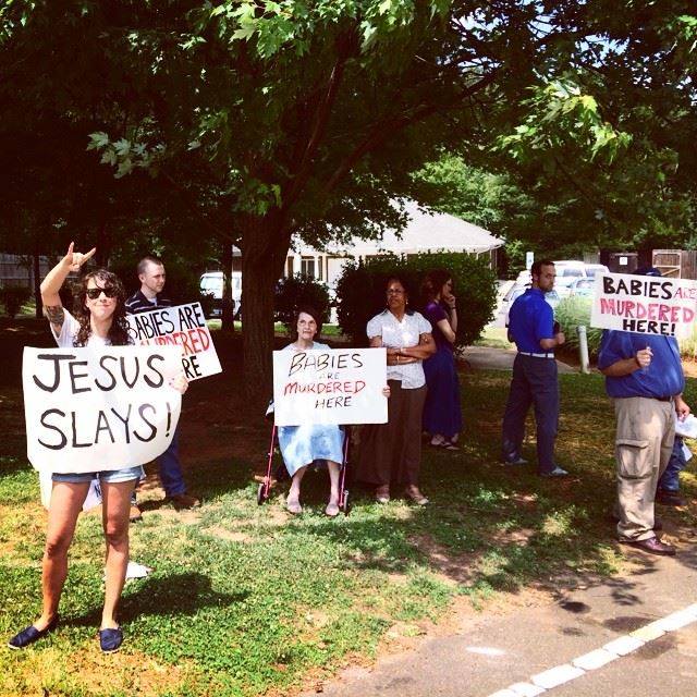 While some pro-life advocates will continue to resort to violence and hate to get their message across, other protesters have more subtle techniques. One Raleigh, N.C., couple—Grayson Haver Currin, a writer for Pitchfork and music editor at Indy Week, and his wife Tina, a copywriter and creative strategist—has been protesting alongside pro-lifers at a clinic in Cary, N.C., every Saturday morning since March. But their signs take a different approach.