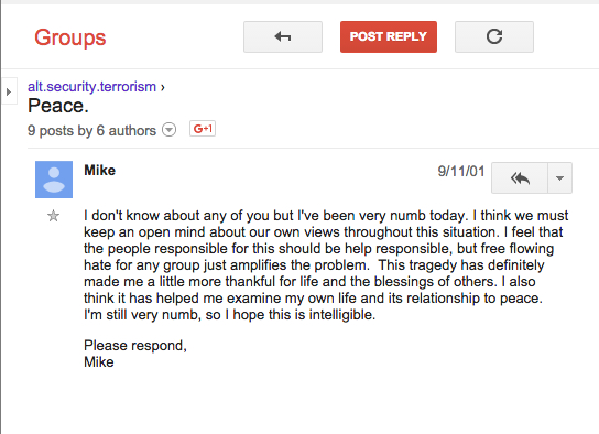 For something completely different, we have somebody being, just... decent. The original host of this channel is unknown, as some people at Google took it upon themselves to log a lot of IRC hosting services. This is the thread's first post, located on alt.security.terrorism (but you can find the rest here):