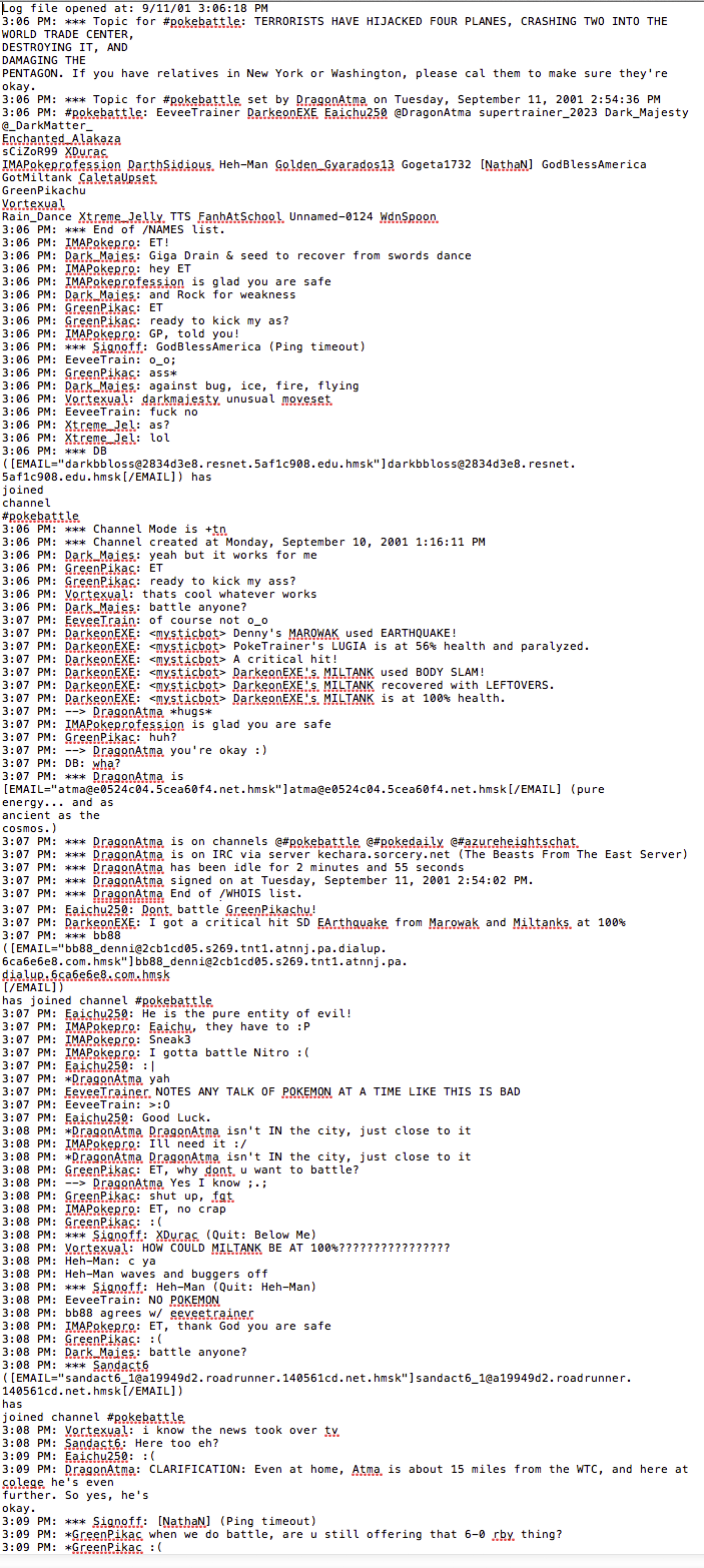 While most of the logs don’t go back as far as 2001 (it seems most archives stop at 2004), we were able to find the logs of four very distinct channels—like #lisp and #pokebattle—to look back at how ordinary people responded to the events of Sept. 11 in real-time. And the reactions are likely not what you'd think.