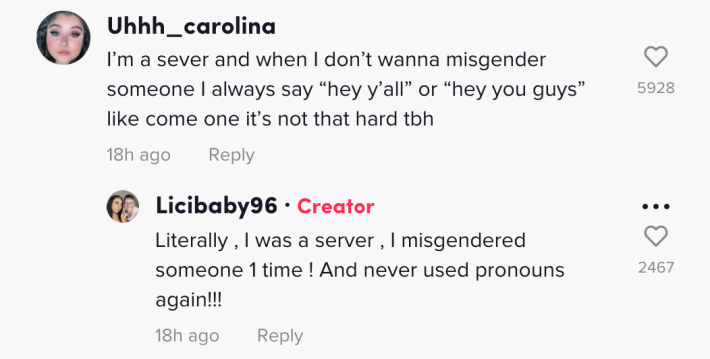 "I’m a [server] and when I don’t wanna misgender someone I always say “hey y’all” or “hey you guys” like come one it’s not that hard tbh," one viewer commented on the video.