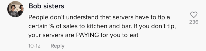 Others wrote that the expectation of not having to tip was "classist," or ignorant. One commenter pointed out that some restaurants also have tipped staff shared tips with kitchen staff.
