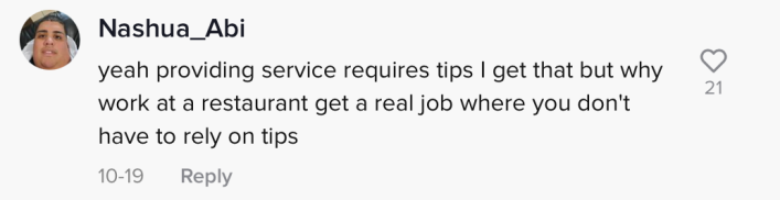 "Yeah providing service requires tips I get that but why work at a restaurant get a real job where you don't have to rely on tips," they wrote.