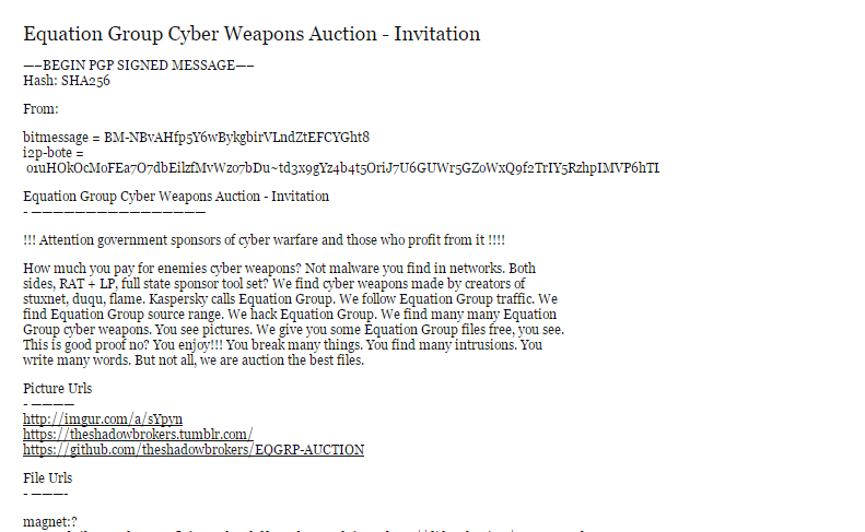 "We follow Equation Group traffic," the Shadow Broker website claims. "We find Equation Group source range. We hack Equation Group. We find many many Equation Group cyber weapons. You see pictures. We give you some Equation Group files free, you see. This is good proof no? You enjoy!!! You break many things. You find many intrusions. You write many words. But not all, we are auction the best files."