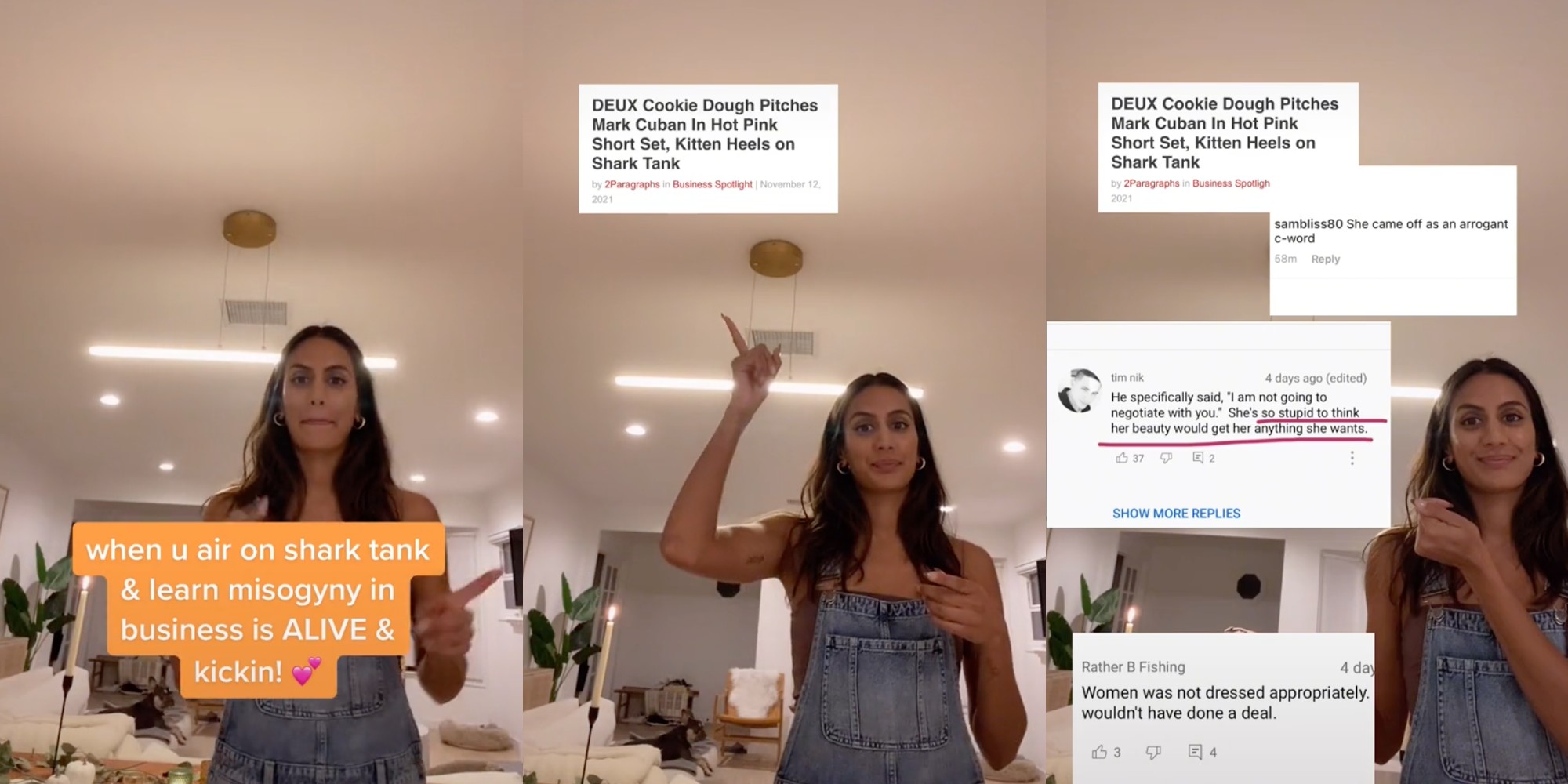 In her TikTok, Ladha says she learned that misogyny in business is “ALIVE and kicking” after the episode aired. She demonstrates her claim by showing screenshots of comments about the outfit she wore during her pitch.