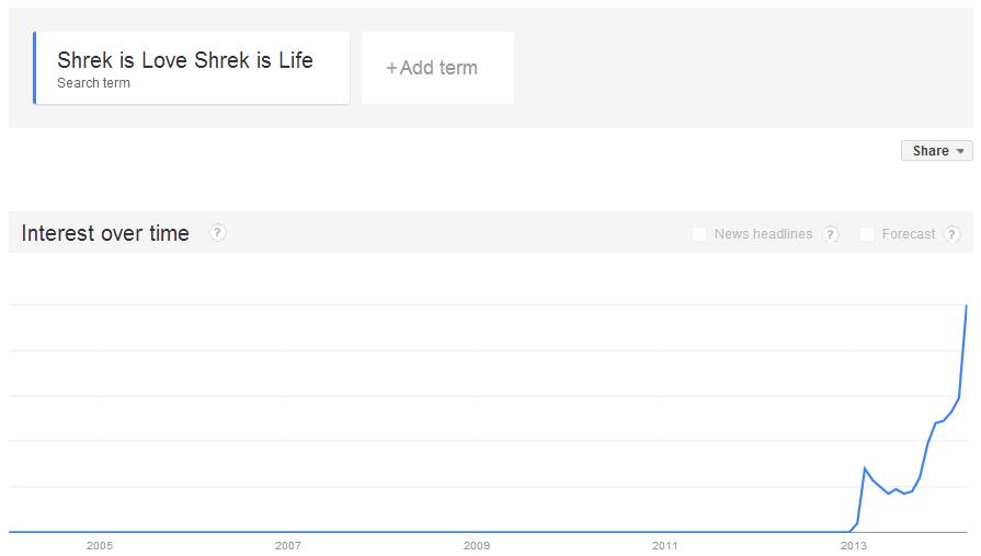 She points out that while the phrase “Shrek is love” is “on the upswing, comparing it to a search for just ‘Shrek" flattens the [Google trends] graph.” Meaning all the online appreciation for Shrek barely factors into his mainstream popularity.