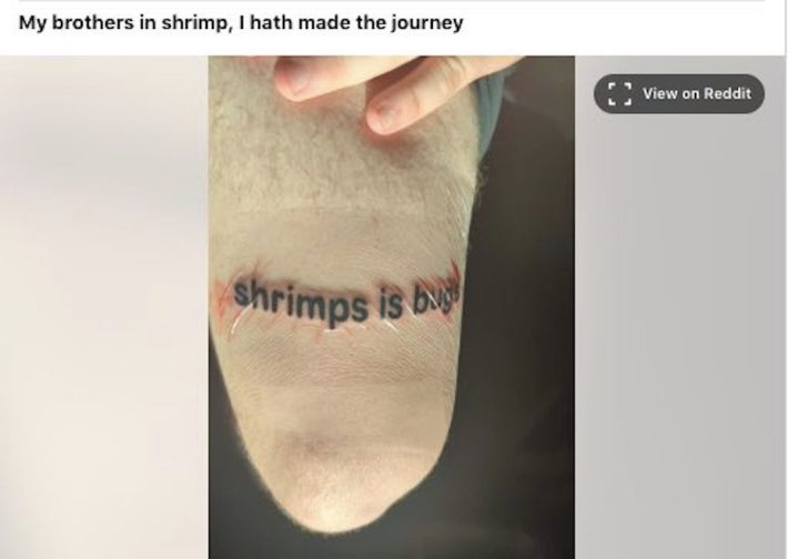 Reddit user u/Lewbular posted a picture of his "shrimps is bugs" tattoo in November 2023 to the /r/TattooDesigns page. It is in simple font just above his knee.