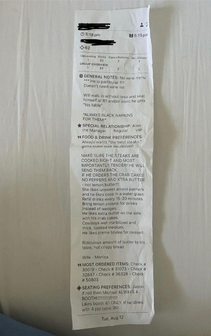 It goes on to say he must ALWAYS have black napkins, along with a bunch of specifics about what food he and his wife like to order, how it should be prepared, how often their drinks should be refilled, and who he prefers as a server.