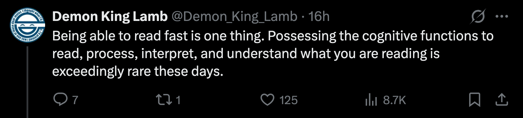 "Being able to read fast is one thing. Possessing the cognitive functions to read, process, interpret, and understand what you are reading is exceedingly rare these days."