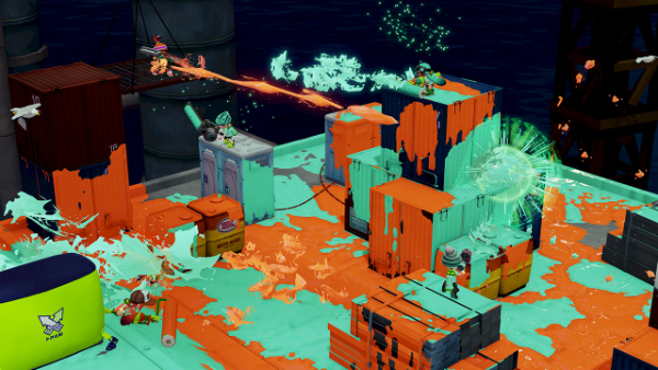 Weapons have secondary and special firing modes. The basic secondary is a pyramid-shaped grenade that splatters ink when it detonates. Special weapons charge up over time and are accordingly powerful. The Inkzooka special, for instance, fires a tornado of ink across the map.