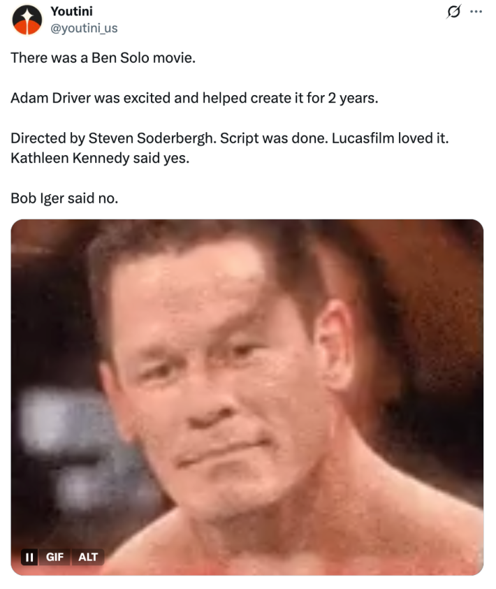 Now that fans know Driver had bigger ideas for Ben, they are extremely mad at Iger and Bergman for nixing the idea. Not only have characters been brought back to life in Star Wars before ("somehow, Palpatine returned" is forever a meme), but Kylo Ren is a fan-favorite character.