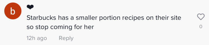 "Starbucks has a smaller portion recipe on their site so stop coming for her," one pointed out.