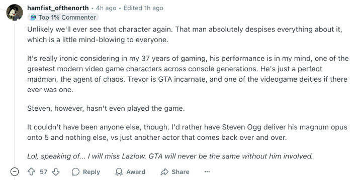 Its arrival onto Reddit, however, also spurred on the creation of another post, titled, “It would be fun,” referencing a previous article from Screenrant where Ogg admitted, “it would be fun if Trevor appeared in [GTA 6] just to be killed at the beginning."
