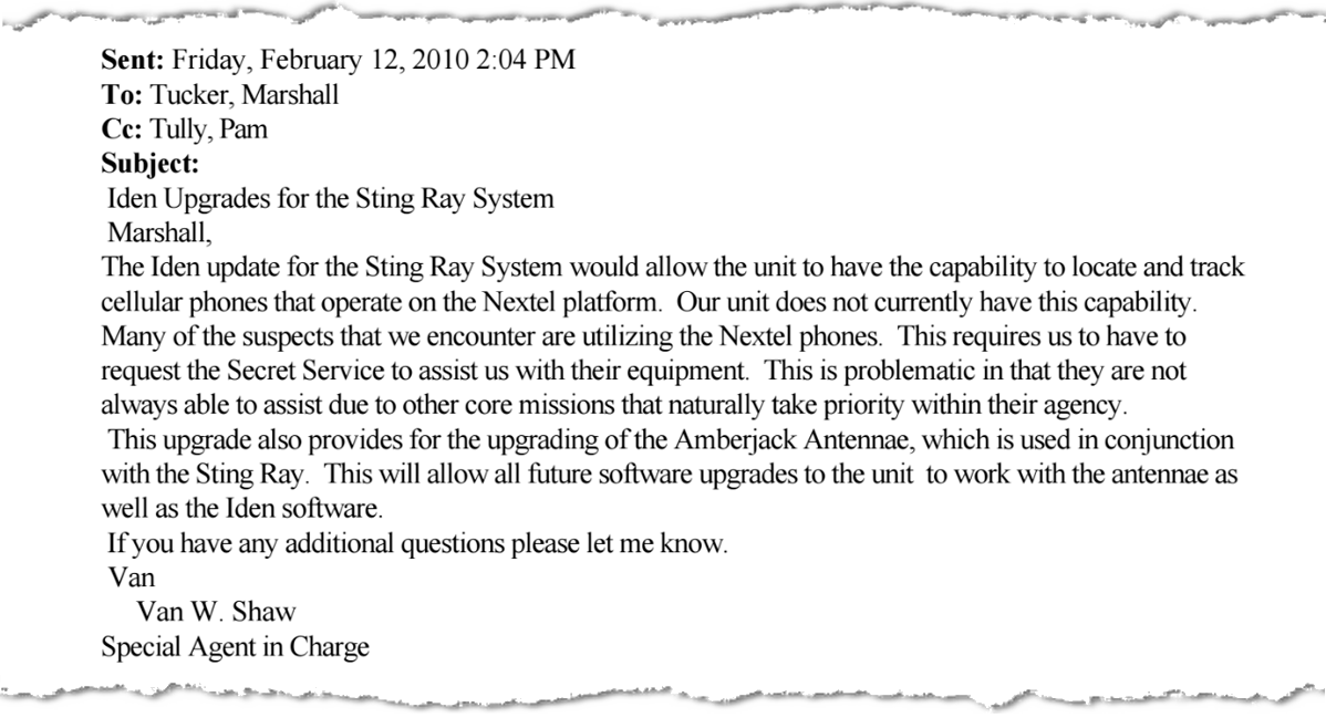 Records from the North Carolina State Bureau of Investigation (SBI) show that in June 2013, $169,500 was expensed by the agency to purchase Harris Corp. hardware, including a “KingFish X1 to HailStorm Upgrade,” in addition to a software package ($22,000), three “Harpoon” signal boosters (up to $22,200), and a wide band “Amber Jack” radio directional finder ($38,400). Internal emails also show that SBI was operating a “Sting Ray” as far back as February 2010, when the SBI assistant director authorized a $60,000 expense to upgrade the device to track Nextel phones.
