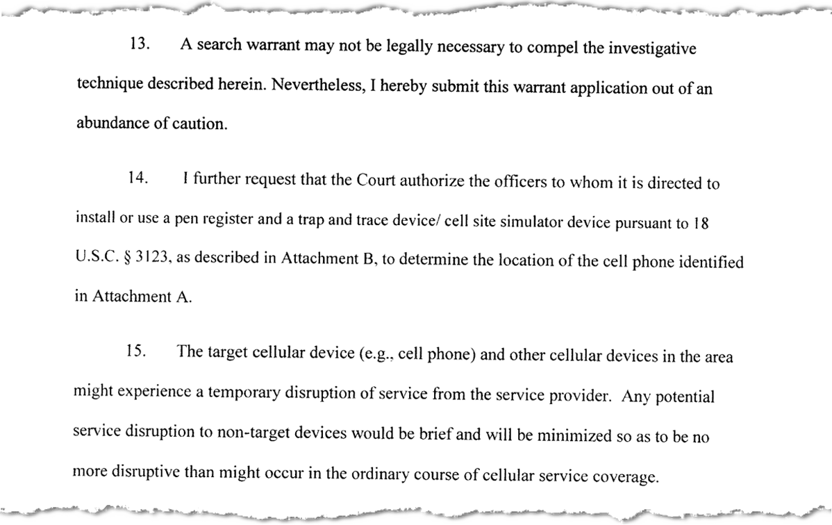 According to Wessler and other legal experts who reviewed the warrant, the DOJ’s template is deliberately vague when police tell a judge exactly what the device they want to use is capable of. The warrant minimizes the device’s expansive surveillance capabilities, effectively lies about the technical consequences to bystanders, and deliberately keeps judges in the dark and shielded from oversight responsibilities.