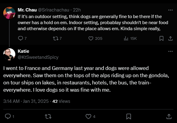 “I went to France and Germany last year and dogs were allowed everywhere,” X user @KtSweetandSpicy replied in a comment to @Srirachachau’s post. “Saw them on the tops of the alps riding up on the gondola, on tour ships on lakes, in restaurants, hotels, the bus, the train- everywhere. I love dogs so it was fine with me.”