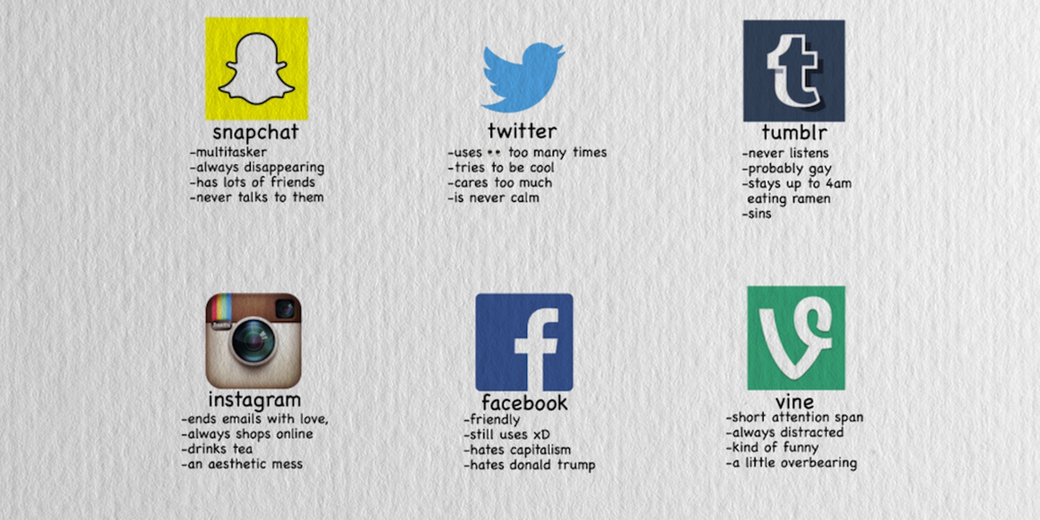 But the archetypes are crudely designed, and the characteristics are often just as strange or sarcastic. The observer reblogs the post, indicating which one they most identify with in the tags section of the post. Think of it as an extension of the self—none of the choices might not be a perfect fit, but one of them will always somehow feel just right.