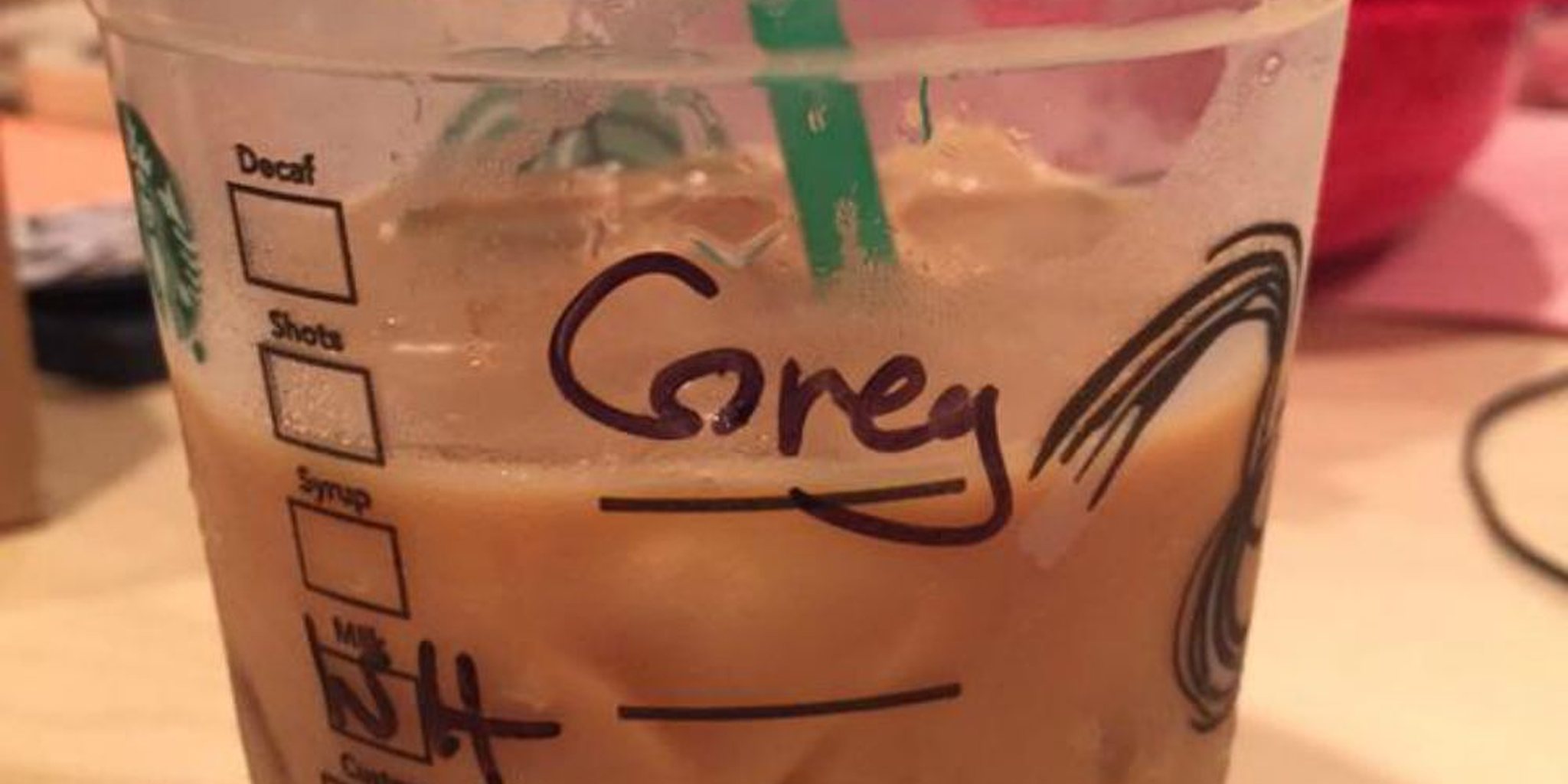 What does the Starbucks cup say: Greg or Corey?