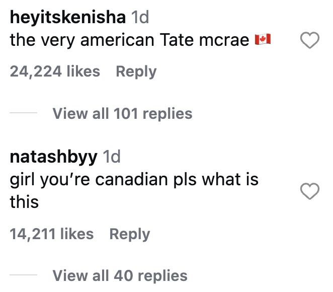 "Team USA? Aren’t you team Canada @tatemcrae?" they asked.