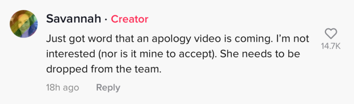 "Just got word that an apology video is coming," she wrote. "I'm not interested (nor is it mine to accept). She needs to be dropped from the team."