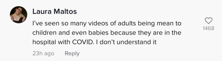 "I've seen so many videos of adults being mean to children and even babies because they are in the hospital with COVID," she wrote. "I don't understand it."