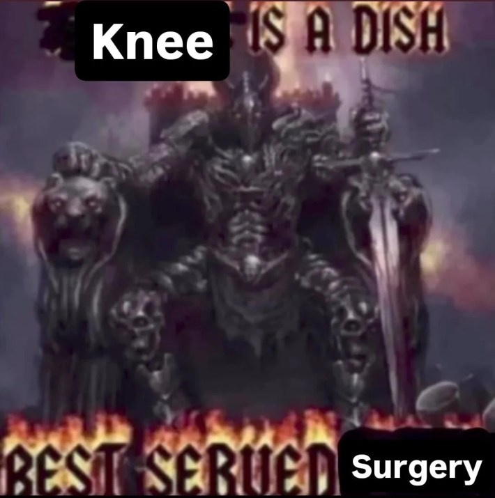 The Knee surgery memes are stubbornly apolitical...so far. We've all learned how quickly a seemingly innocuous meme can take a turn. But it is an absurdist, nonsensical meme, a meme about memes. A meme for memeheads, if you will. Requests to explain it will often be answered with: "25+ Best Knee Surgery Memes."