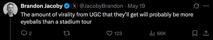 “The amount of virality from UGC that they’ll get will probably be more eyeballs than a stadium tour,” commented @BrandonJacoby.