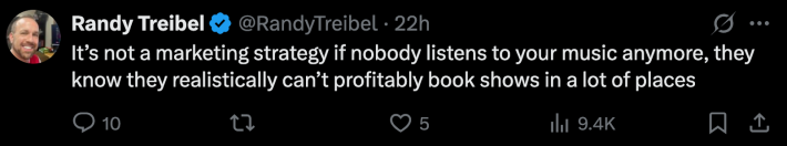 Okay, boo to this comment, but @RandyTreibel could have a point, “It’s not a marketing strategy if nobody listens to your music anymore, they know they realistically can’t profitably book shows in a lot of places.”