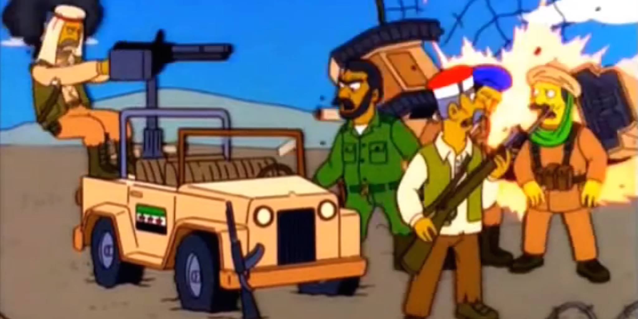 In the 13-year-old episode New Kids on the Blecch, Bart becomes part of pre-teen pop group Party Posse. In one of their music videos—which is later revealed to be subliminal advertising for the Navy—the band members fly fighter jets, and drop bombs on generic Middle-Eastern military figures. On the side of the Arab vehicle, the host points out, is a flag remarkably similar to the one used by the anti-government forces in the ongoing Syrian Civil War.