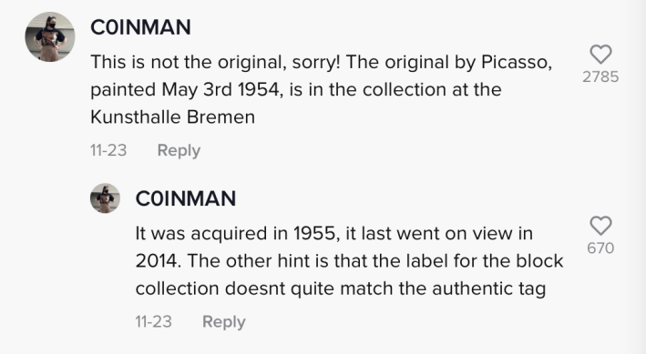 "This is not the original, sorry!" one commenter wrote. "The original by Picasso, painted May 3, 1954, is in the collection at the Kunsthalle Bremen. I was acquired in 1955, it last went on view in 2014. The other hint is that the label for the block collection doesn't quite match the authentic tag."