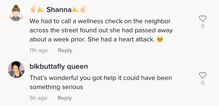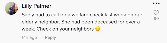"Sadly had to call for a welfare check last week on our elderly neighbor," @subisyn said. "She had been deceased for over a week. Check on your neighbors."