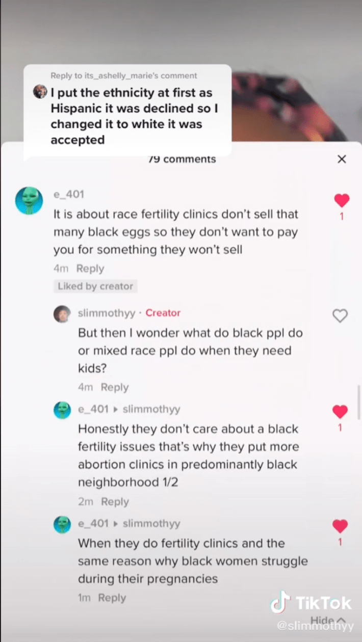In a follow-up video addressing a commenter who says their application to Your Eggs was denied when they listed their race as Hispanic, Jones shouts out a comment on her original video from TikTok user @e_401 that says "fertility clinics don't sell that many Black eggs so they don't want to pay you for something they won't sell."