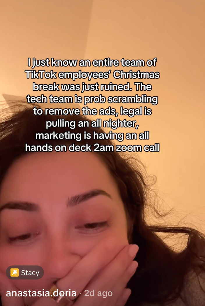 "I just know an entire team of TikTok employees' Christmas break was just ruined," wrote @anastasia.doria on TikTok.